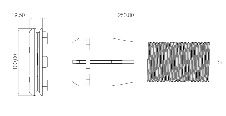 Prise à balai avec le passe paroi de 250 mm, avec raccord à coller Ø50 mm ou fileté mâle 2”, pour piscine avec membrane/liner ou béton, avec inserts en laiton fileté.