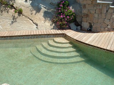 Escalier en fibre de verre et acrylique de forme classique. L’escalier convient à tous les types de piscines en maçonnerie préfabriquées ou traditionnelles.